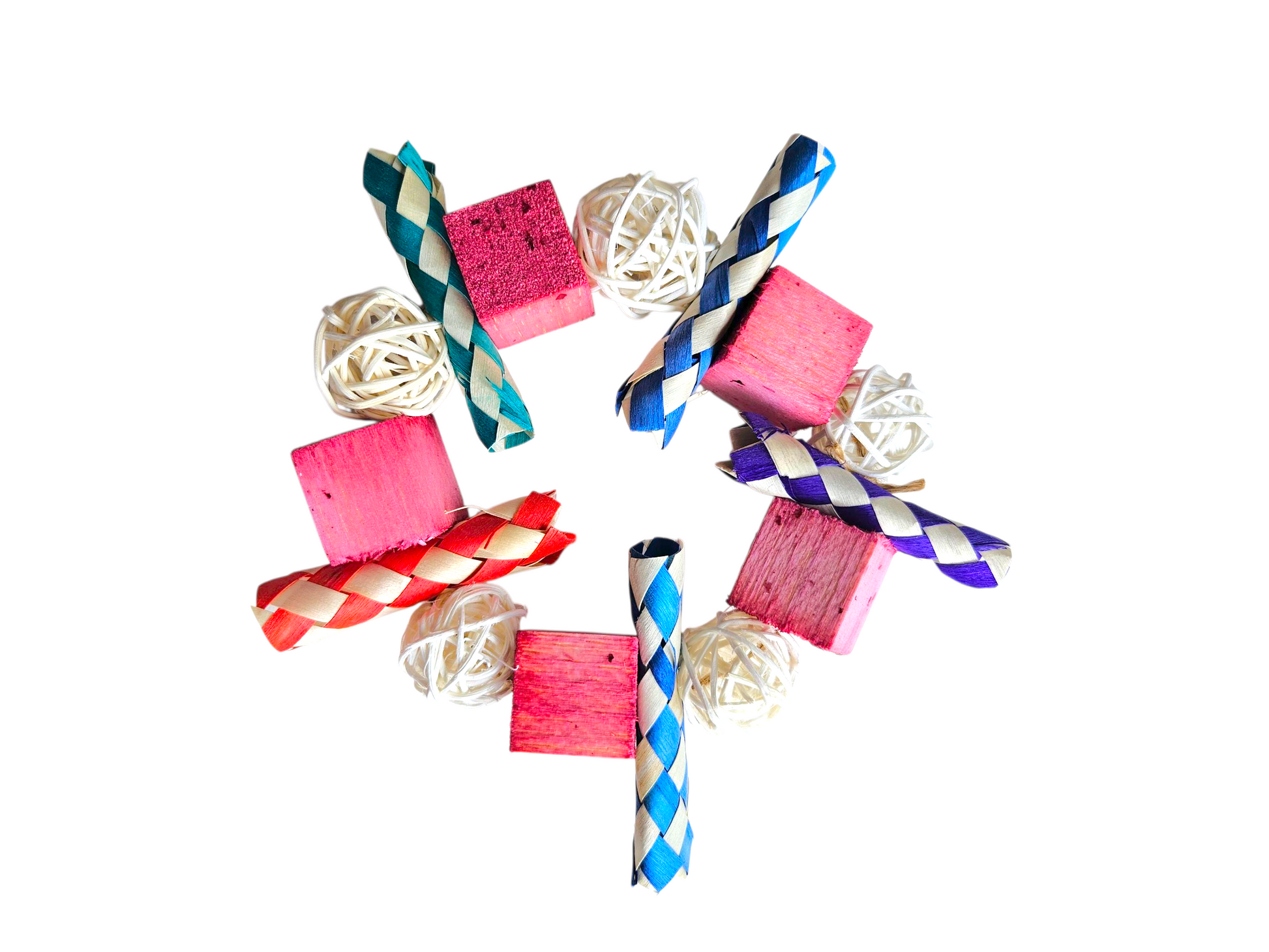 Made from soft balsa wood cubes infused with the natural flavours of berries, colourful bamboo chews & rattan balls, this chunky toy offers a variety of textures that are perfect for chewing, tossing & exploring.