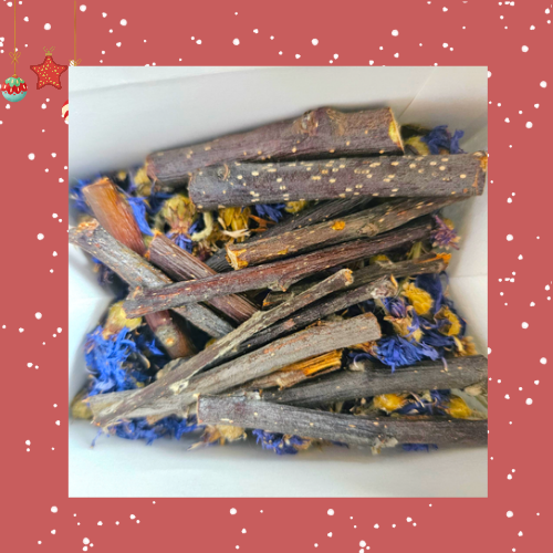 Packed with seasonal goodness, this adorable paper forage bag is generously stuffed with a chilly day blend of soft oat hay, crunchy apple leaves, refreshing mint leaves, and a sprinkle of blue cornflower petals for a pop of frosty colour. To top it off, Puddles carries a bundle of apple twiglets making it perfect for nibbling, chewing and enriching your pet’s day.