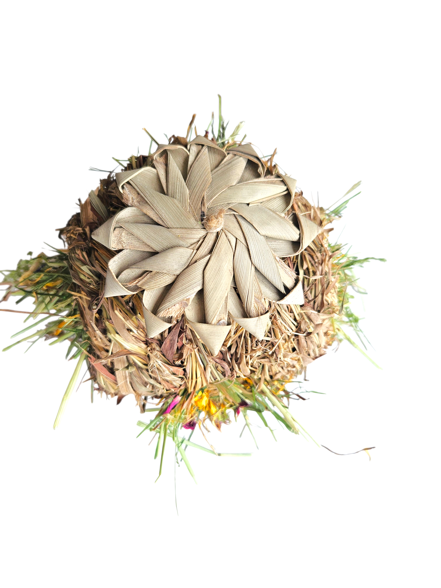 Our natural Spring Meadow Orb is generously packed with a premium blend of dried grasses and florals, creating a fun and enriching forage toy that encourages natural nibbling, exploring and play. A natural woven palm leaf flower is tied to the top, adding a charming springtime touch.